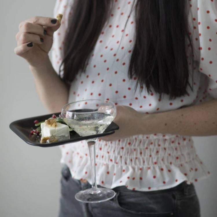 Det fleksible lille bærebrettet lar deg holde både fingermaten og glasset med én hånd. Du trenger ikke gå rundt og holde glasset på festen, da du i stedet får en fri hånd til å hilse på eller bære noe annet inn.