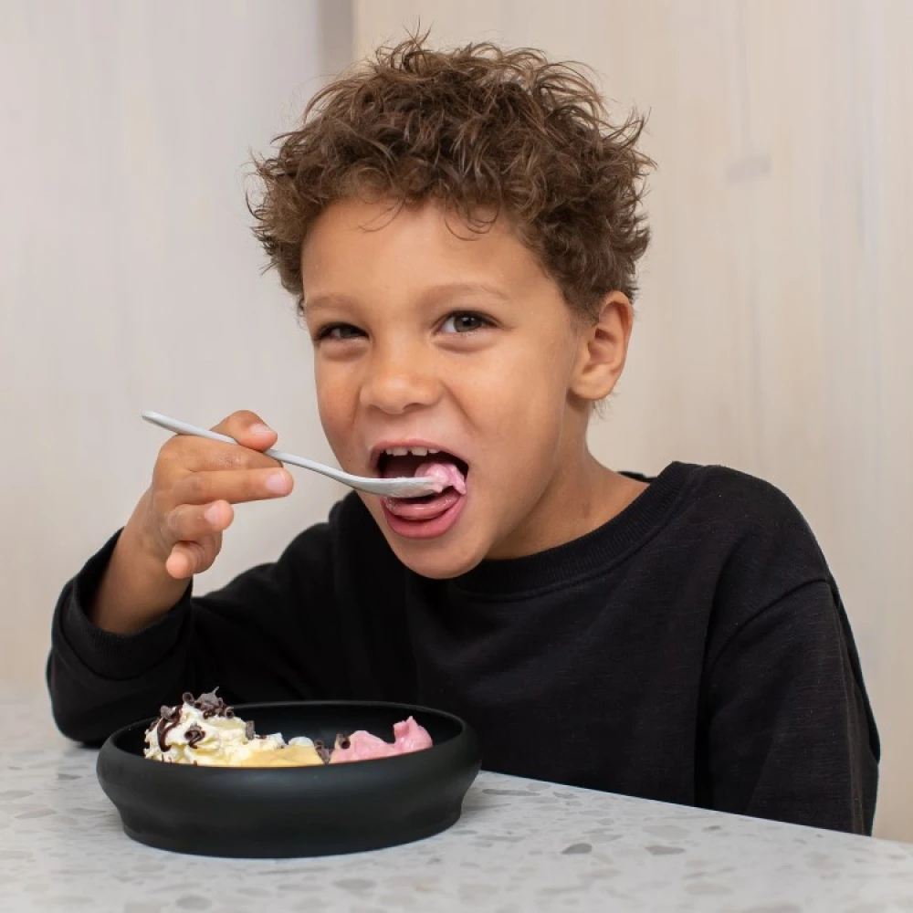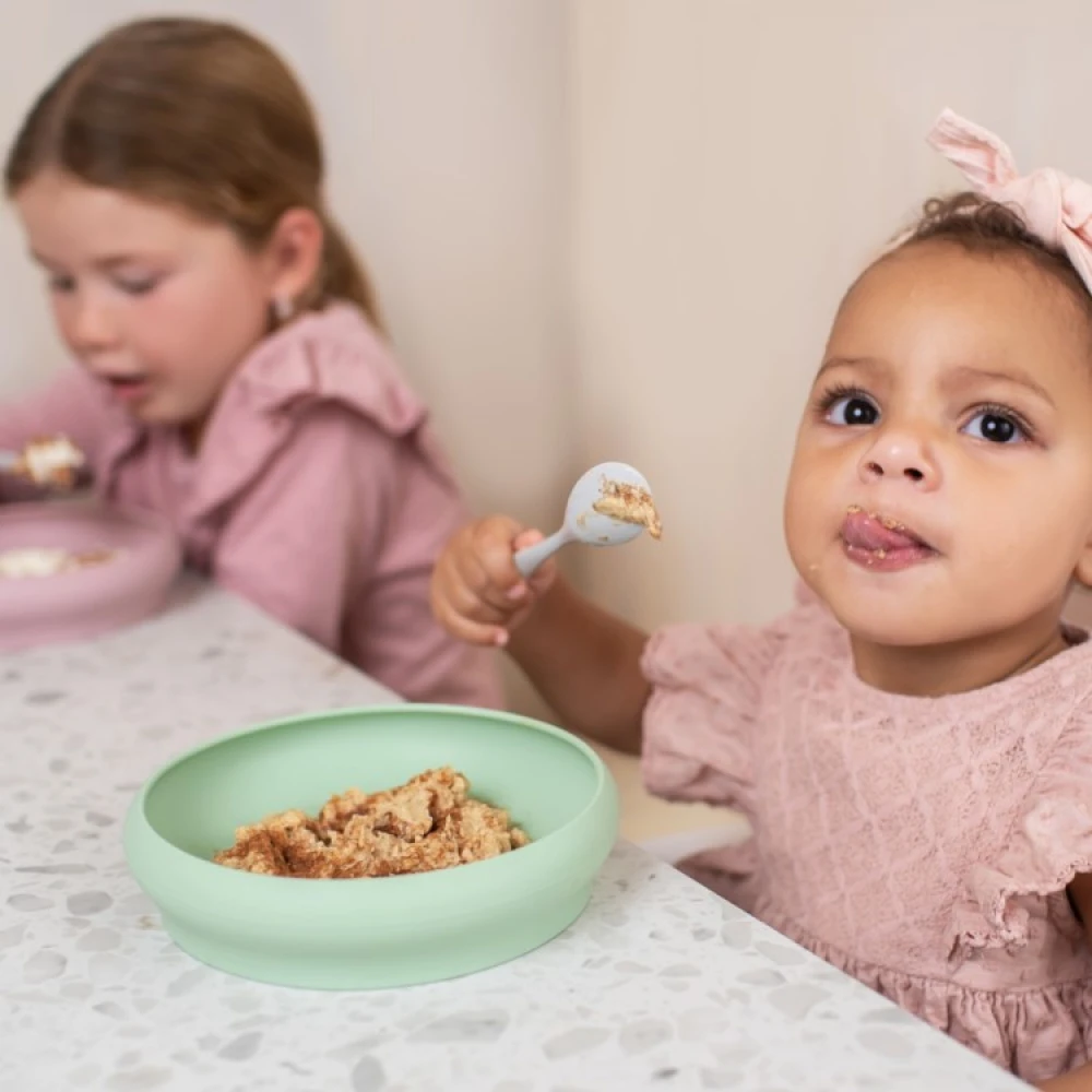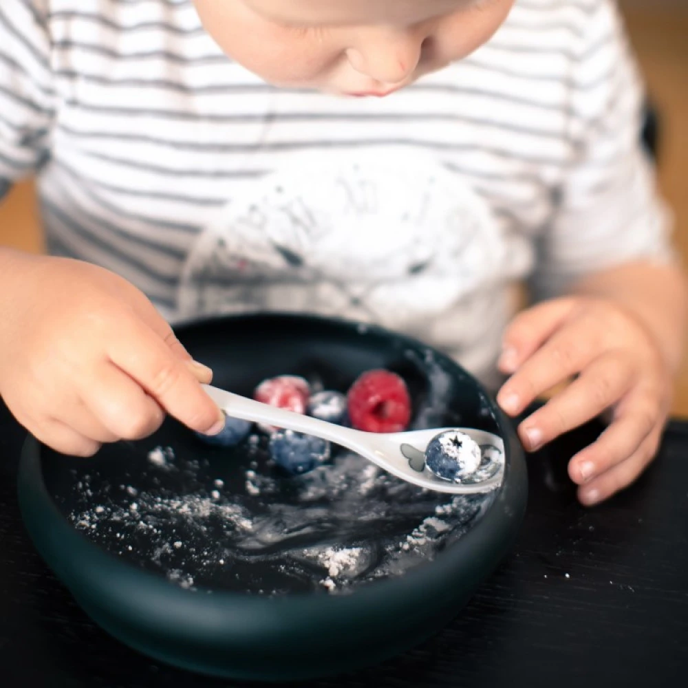 Barnetallerkenene fra norske Naomi er stødige silikontallerkener med høy kant som gjør det enklere for barn som vil spise selv. Den skålformede tallerkenens innbøyde kanter hjelper barnet med å få opp maten på skjeen og gir en følelse av å klare selv.