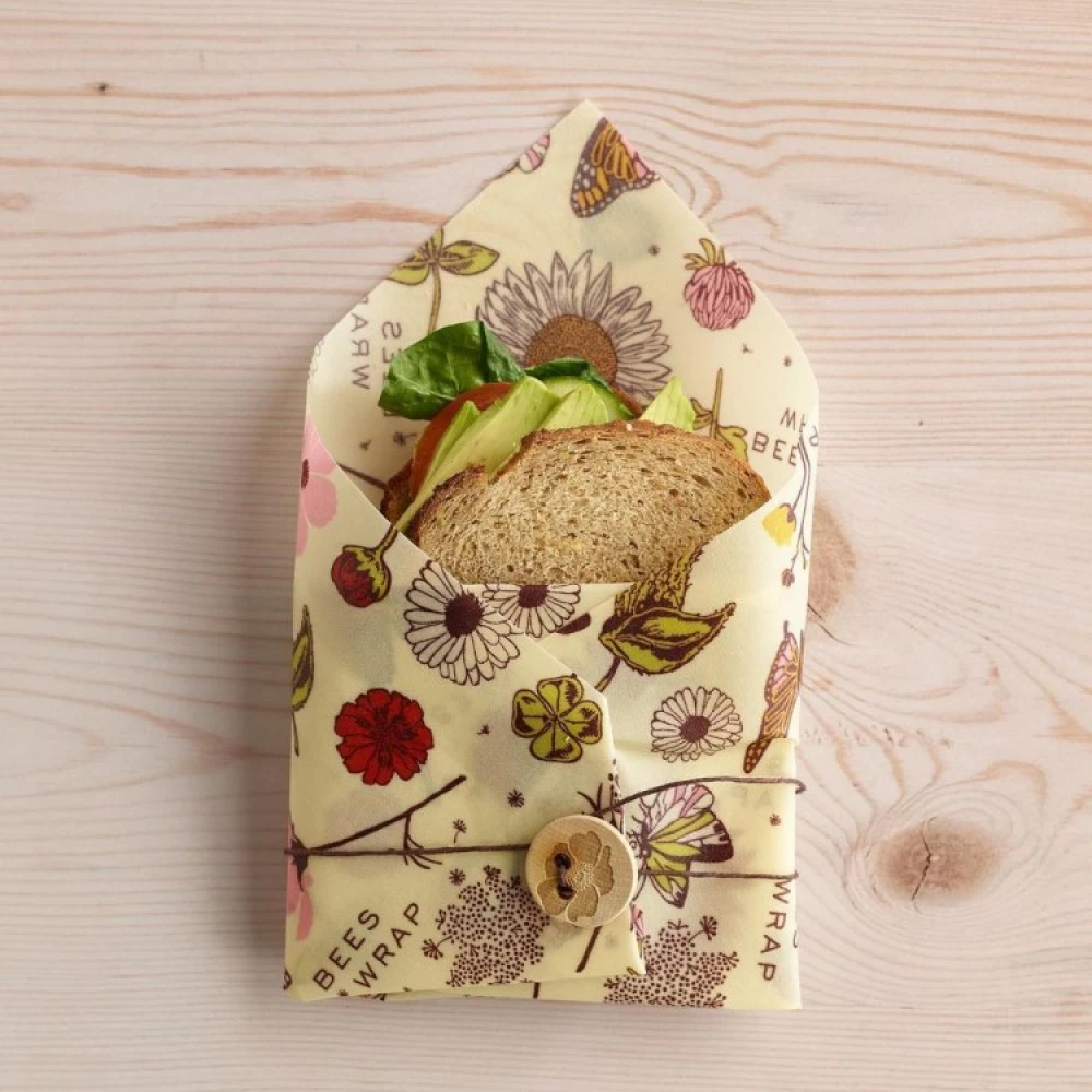 Pakken inneholder et vokspapir med en liten treknapp. Akkurat stor nok til å pakke inn lunjsen eller smørbrødet til turen. Lag smørbrødet, brett inn kantene på voksduken og snurr snoren rundt treknappen slik at smørbrødet holder seg på plass.