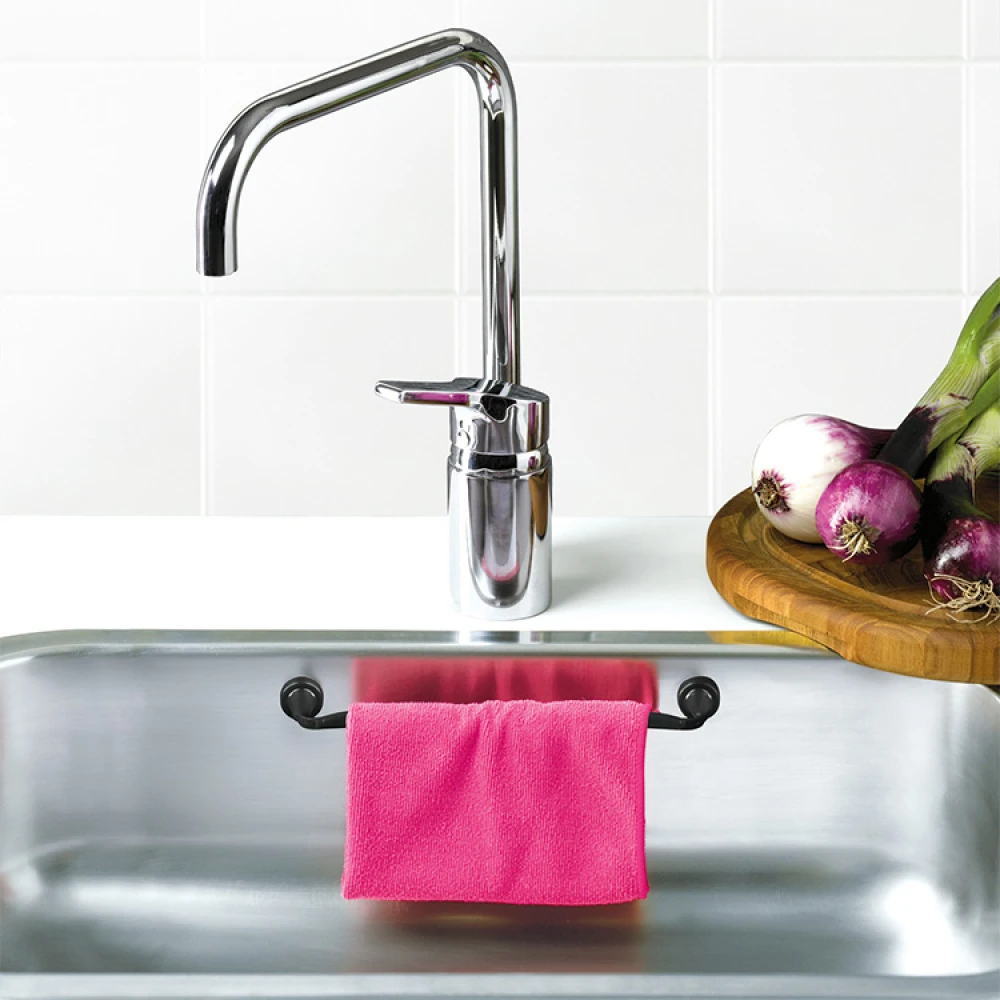 Denne bøyelige oppvaskklutholderen er praktisk og fin å henge oppvaskkluten på, og den kan brukes i både rette og runde oppvaskkummer. Oppvaskklutholderen er veldig enkel å montere, og den kan plasseres både langs veggen eller festes i hjørnet på oppvaskkummen.