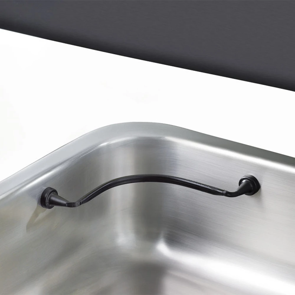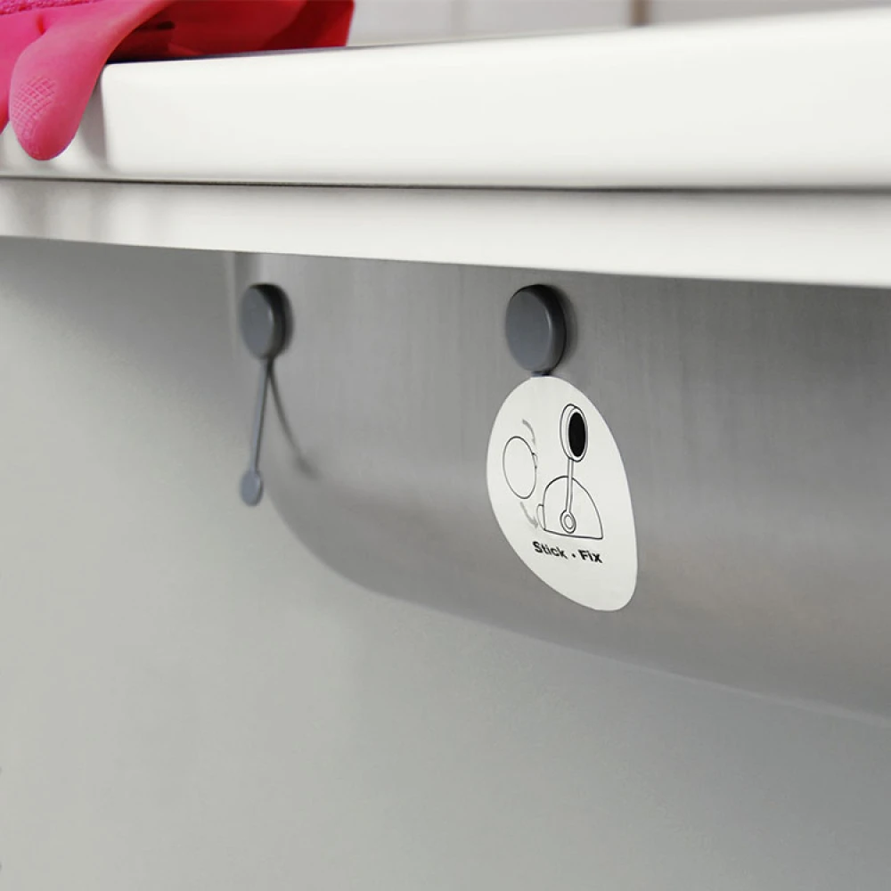 Bøy holderen til den passer i din oppvaskkum, og fest den med to kraftige motmagneter som du setter på utsiden av oppvaskkummen (inni skapet). Magnetene er enkle å flytte eller fjerne, og du trenger ikke å bruke noe verktøy.
