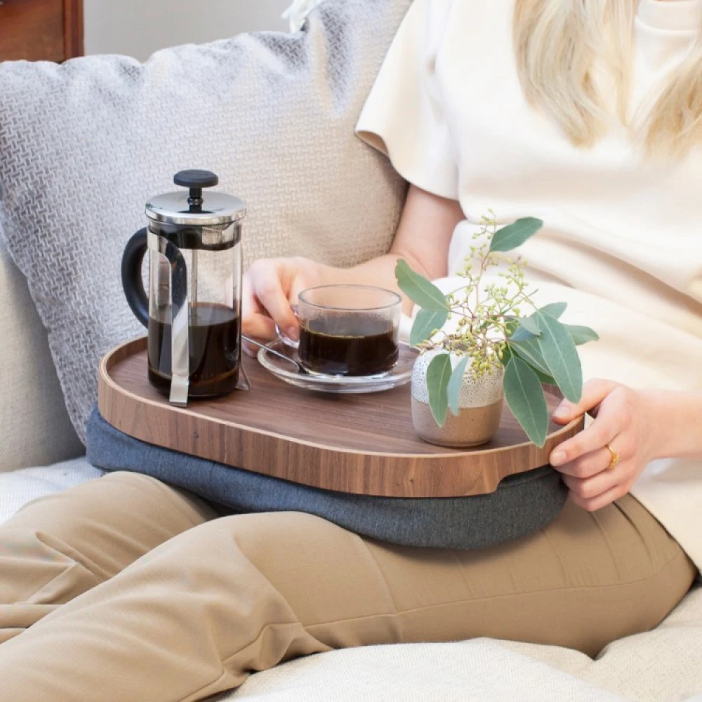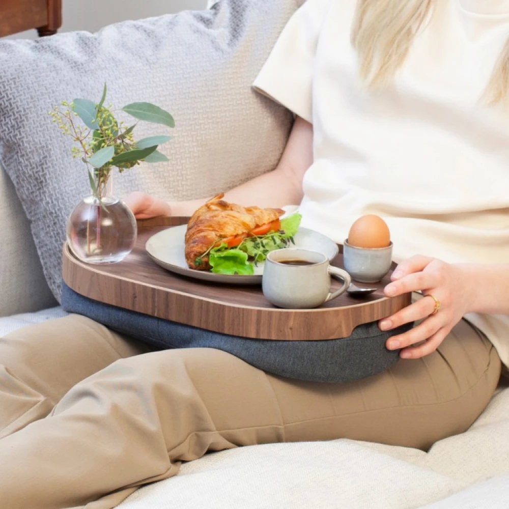 Den myke puten under ligger behagelig mot bena og det tilpasningsdyktige fyllet er mulig å flytte rundt for å tilpasse vinkelen på brettet. Puten kan tas løs fra brettet og har et avtagbart overtrekk som går ann å vaske.