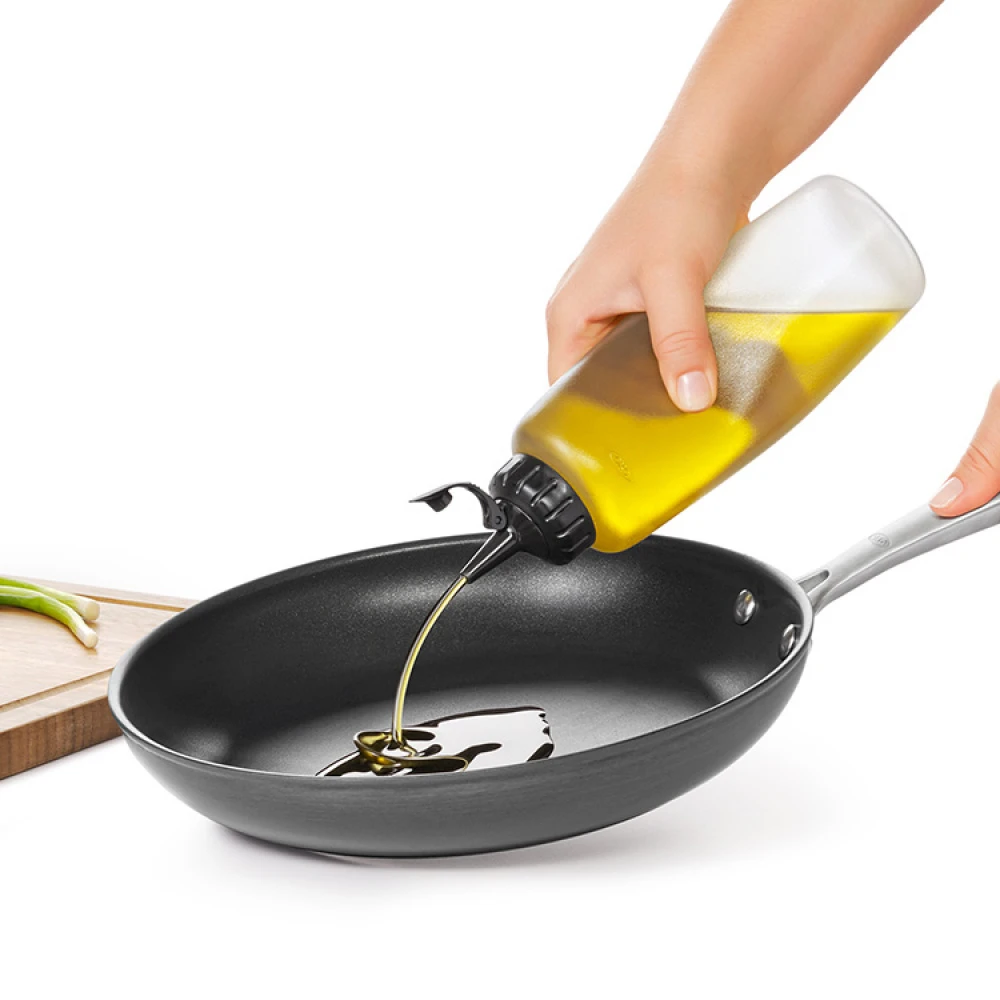 Du bestemmer hvor mye du vil porsjonere ut ved å trykke på flasken. Den lille helletuten gir god kontroll på flyten, og du kan helle olje i stekepannen, sprinkle dressing over en salat ellergarnere tallerkenen med presisjon.