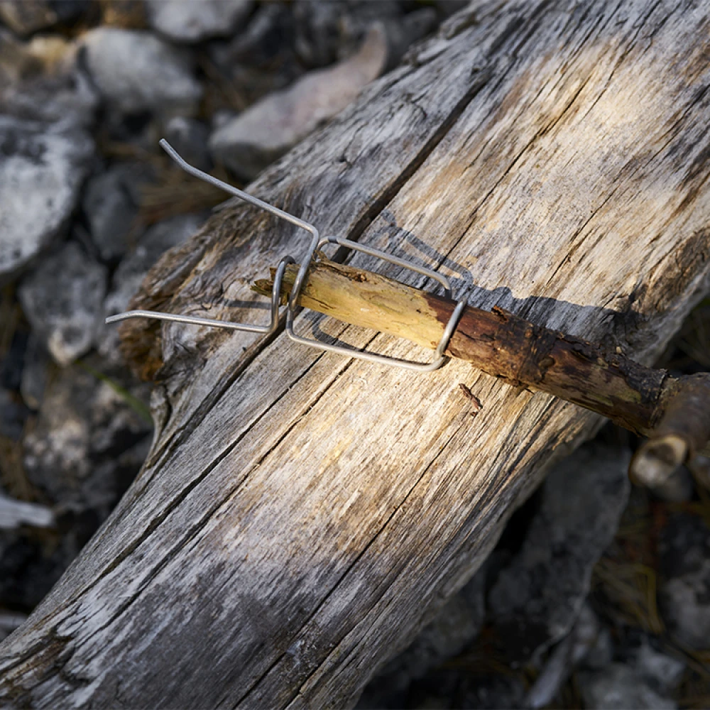 Grillgaffelen er lett, slitesterk og laget av ett stykke rustfri stålvaier. Den smarte låsen gjør det enkelt å finne en pinne som er passe stor til at du kan bruke den som håndtak. Låsen gjør også at gaffelen kniper seg fast på pinnen, slik at den ikke risikerer å falle ned i bålet.