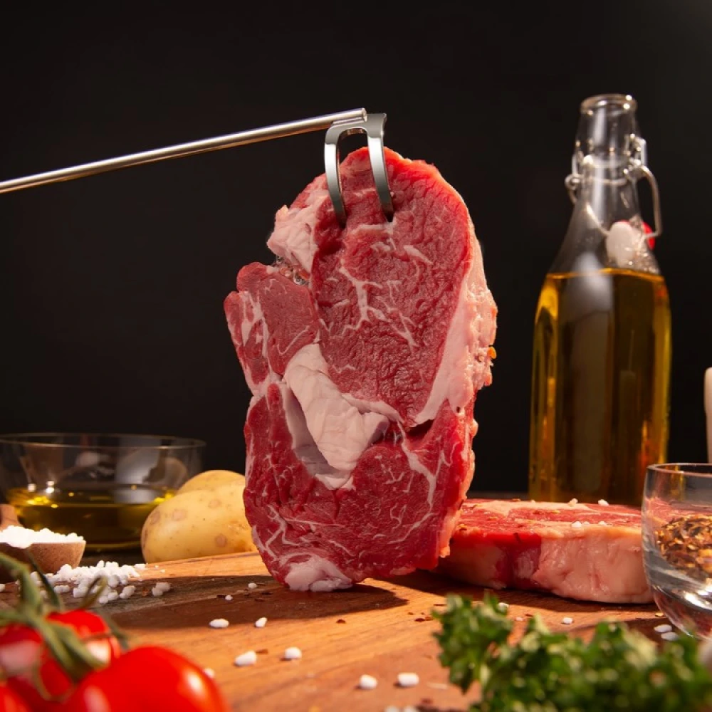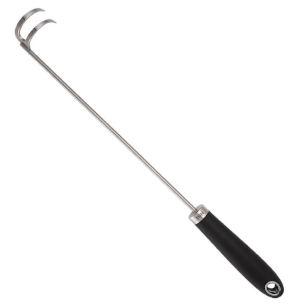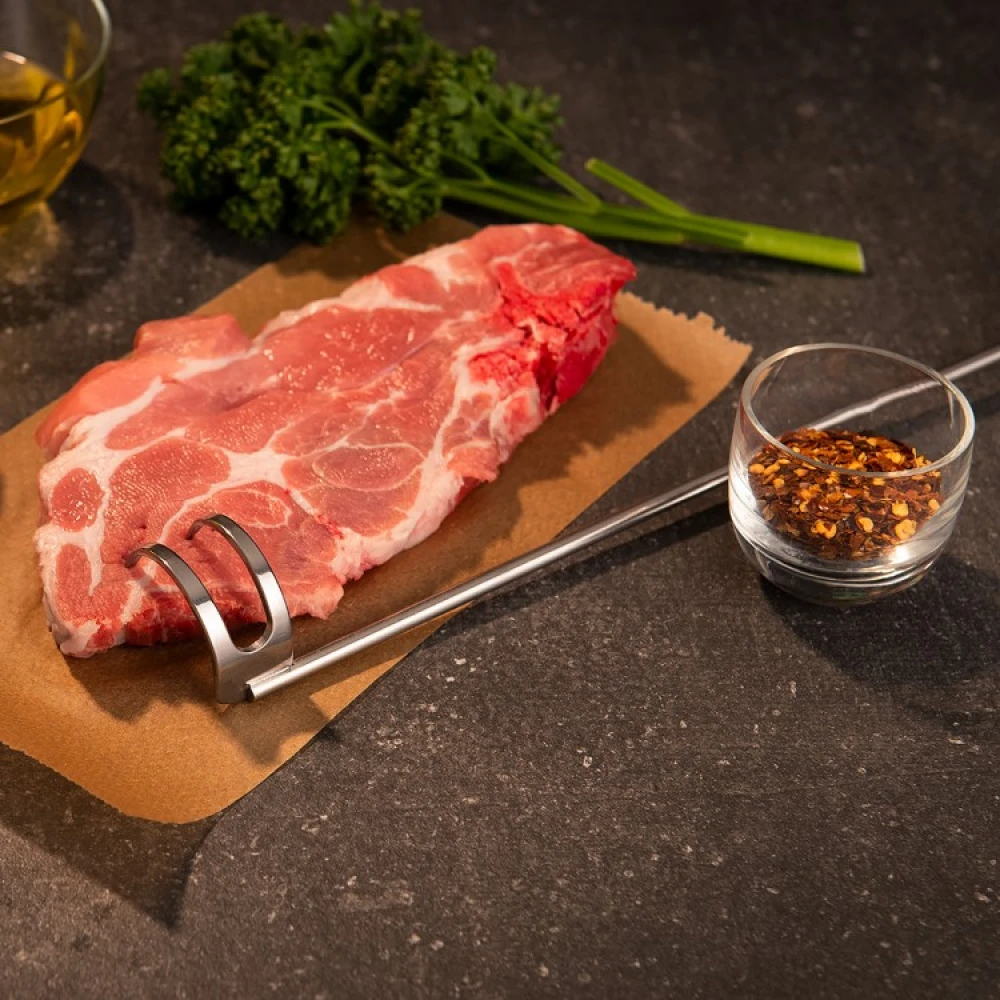 Grillpinnen er ikke bare et utmerket grillverktøy, men er også smart å bruke når du steker kjøtt i stekepannen. Bare vær litt forsiktig når du setter inn spissene i råvaren, slik at du ikke skyver så hardt at krokene går gjennom kjøttet og inn i pannen ved et uhell.