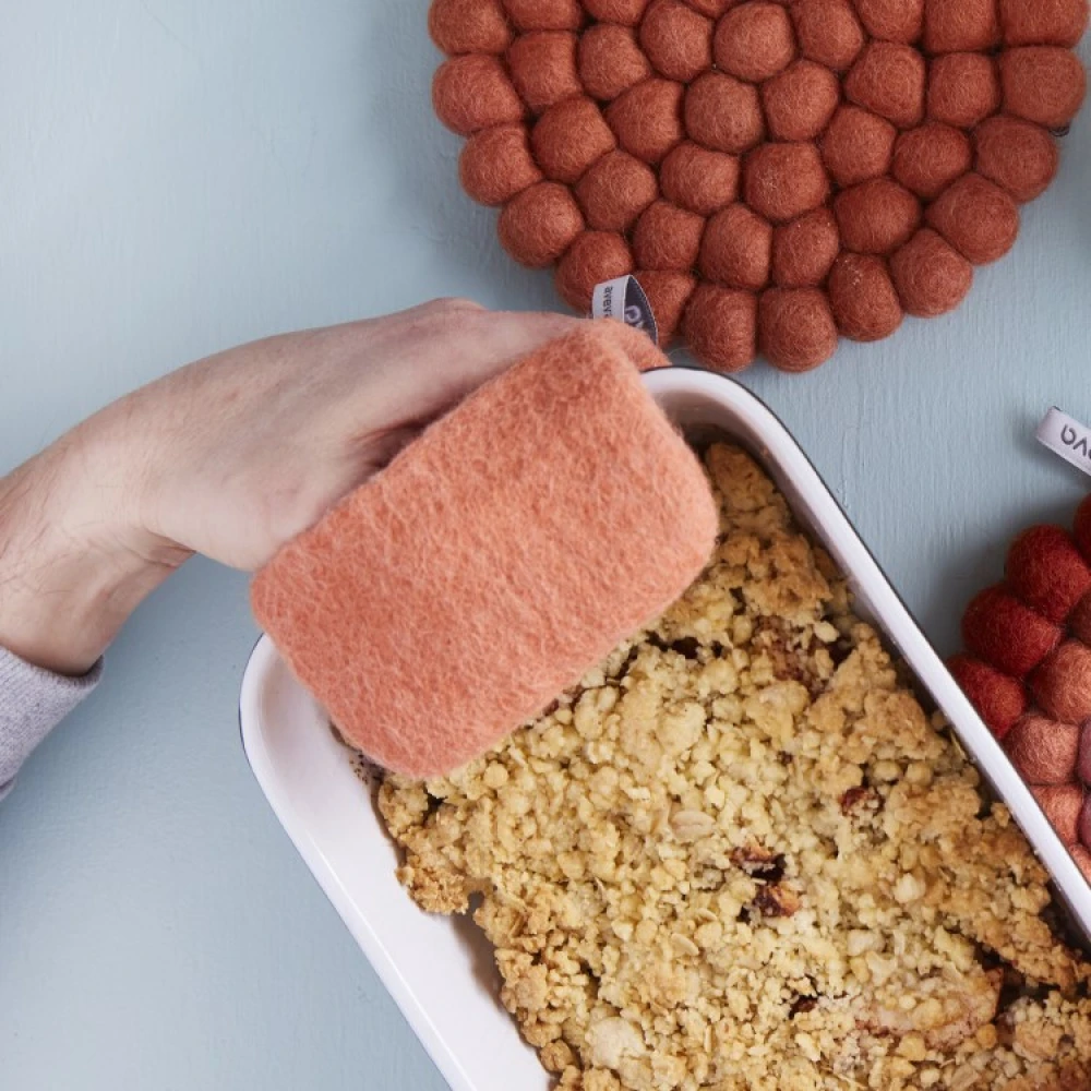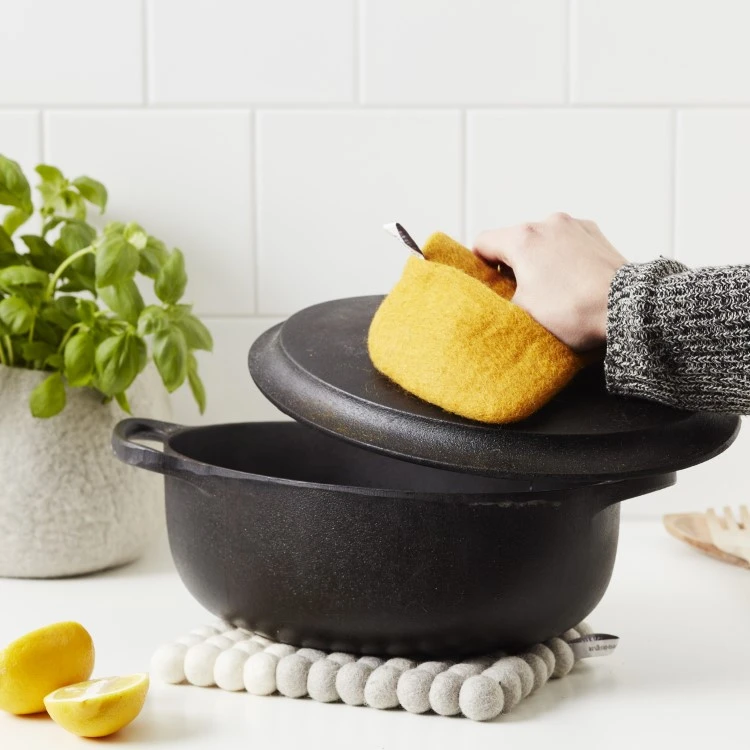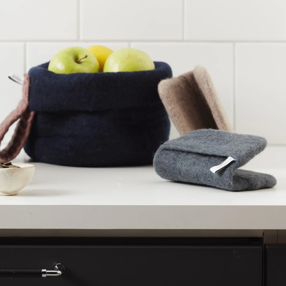 Håndlaget gryteklut av 100% ull med smarte lommer til fingrene som gir et godt grep og gjør at du enkelt kan håndtere varme gryter, bakeplater og stekepanner. Den slitesterke grytekluten er smussavvisende, varmeisolerende og finner i flere fine farger.