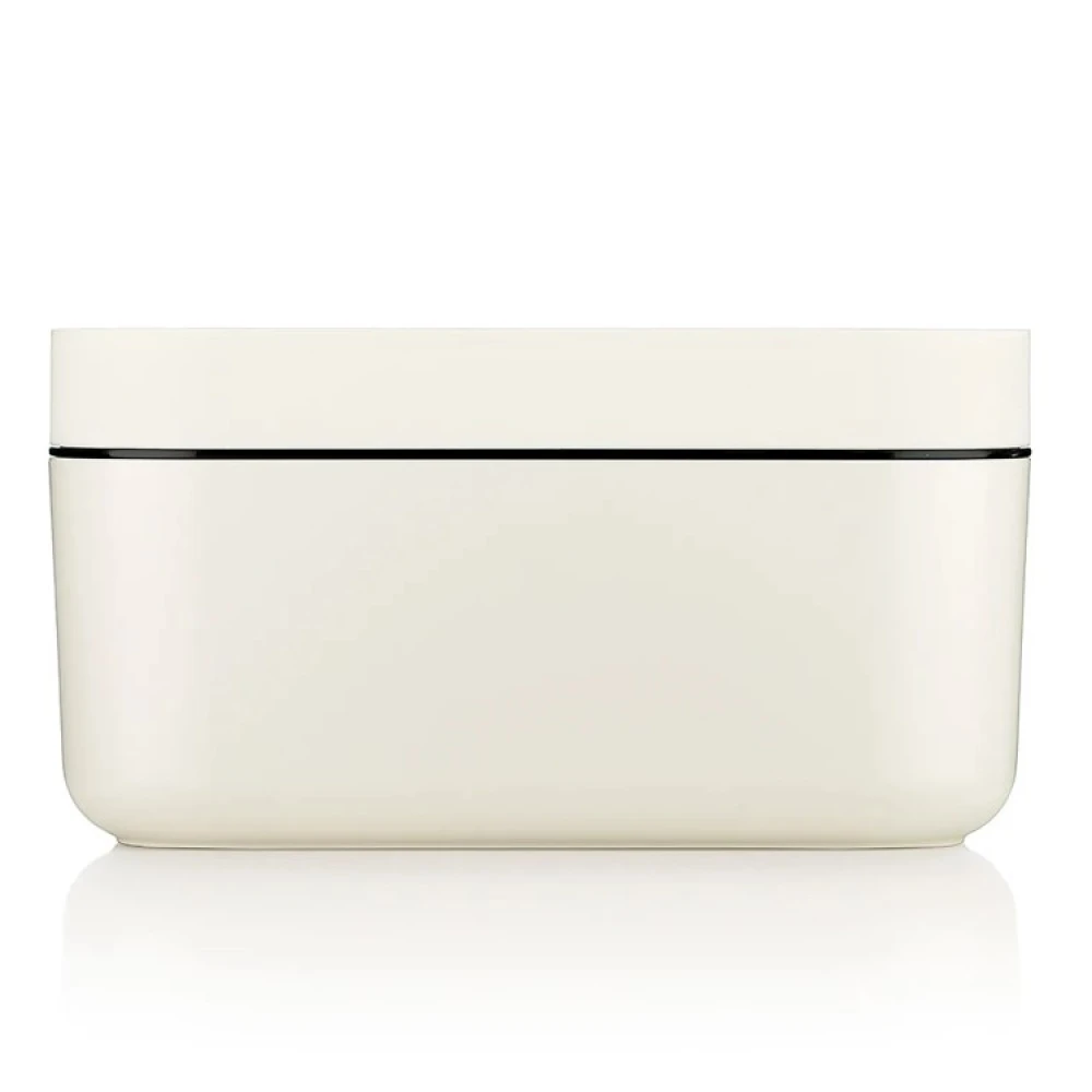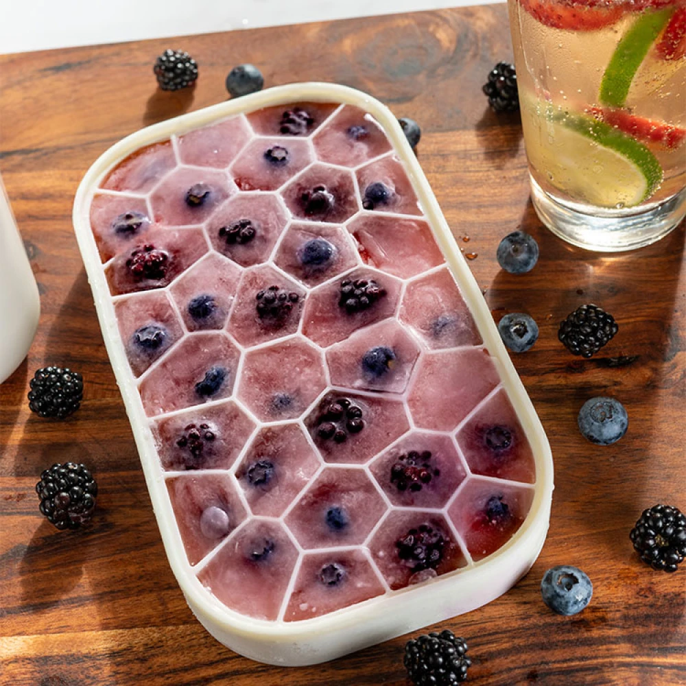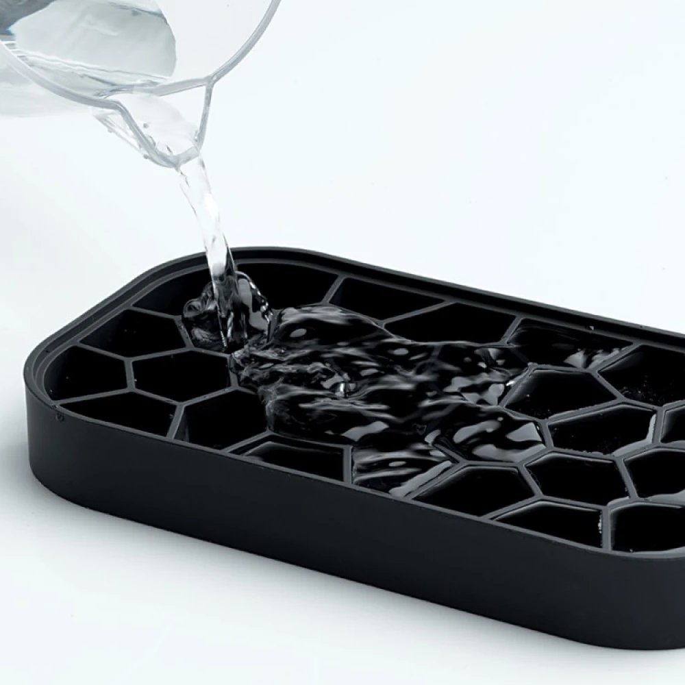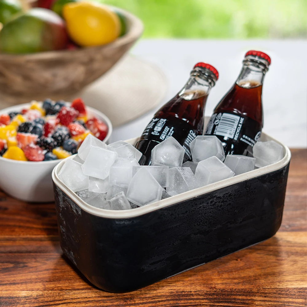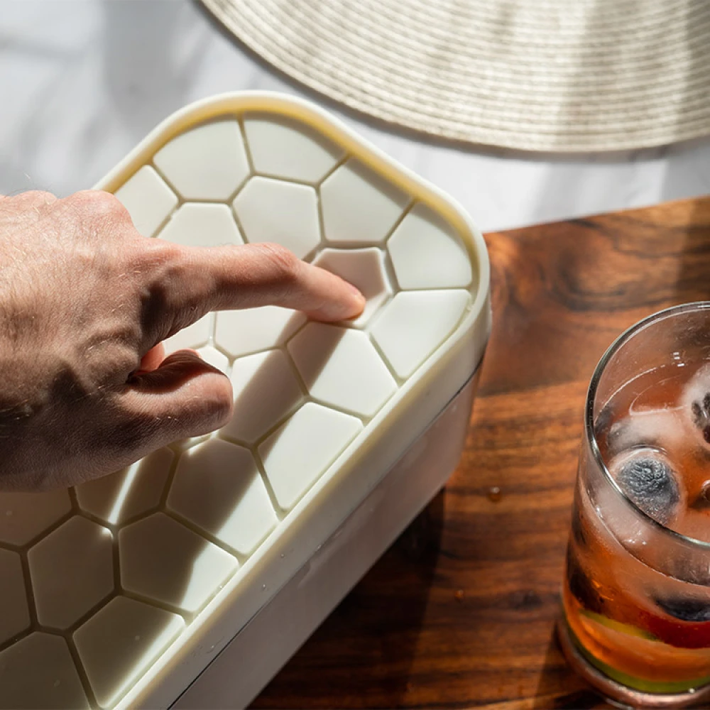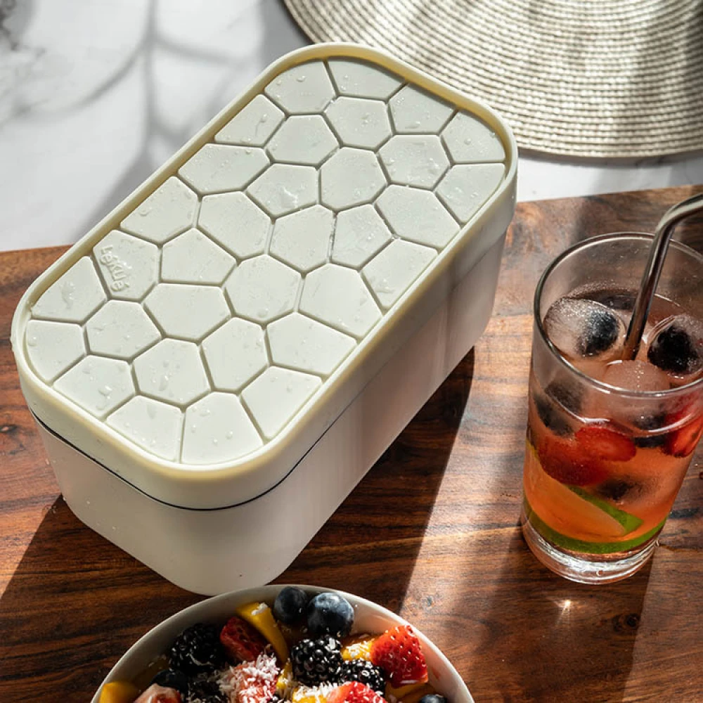 Isbitboksen er en smart skuffe med tilhørende oppbevaringsboks. Isbitene lages i brettet som også fungerer som boksens lokk og oppbevares deretter i boksen, noe som ikke bare er praktisk, men også veldig fint. Boksen på 1,5 liter rommer tre isbrett eller 132 isbiter. Isbitene holder seg i 9 timer utenfor fryseren hvis de oppbevares i boksen.