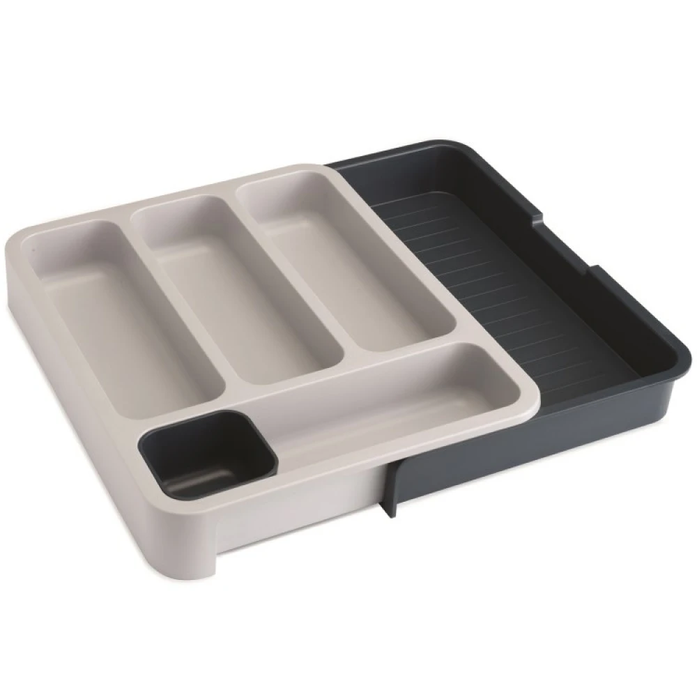 Denne justerbare bestikkskuffen fra Joseph Joseph er en uttrekkbar skuffinnsats med flere smarte rom, som gjør det enkelt med organisering i kjøkkenskuffen din. Den justerbare bestikkskuffen kan enkelt tilpasses bredden på kjøkkenskuffen og er dermed smart å bruke i både smale og vanlige kjøkkenskuffer.