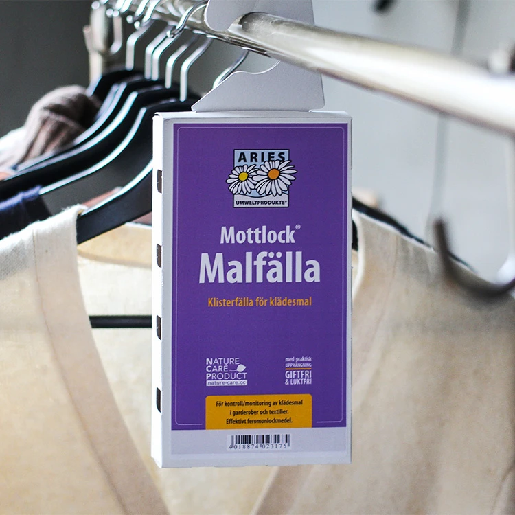 Effektiv og giftfri klisterfelle mot klesmøll, som lokker til seg hannmøll og fanger dem på kraftige klisterpapir. Fellen fungerer mot de vanligste typene pels- og klesmøll, og den henges enkelt opp blant klærne i garderoben din med en krok.