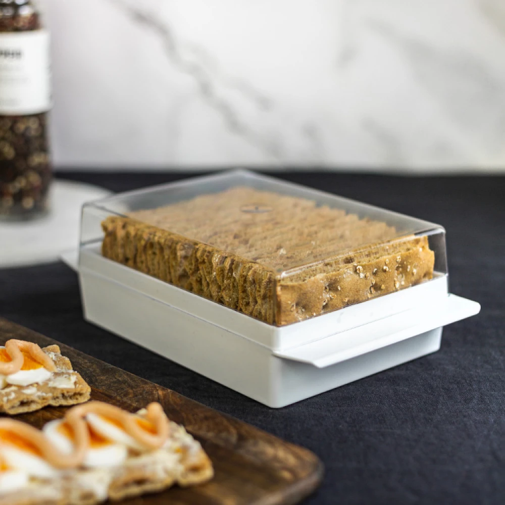 Lokket er også flatt, som betyr at du også kan stable andre kjøkkenartikler eller flere oppbevaringsbokser oppå hverandre. Oppbevaringsboksen for knekkebrød er enkel å vaske for hånd, men kan også vaskes i oppvaskmaskin.