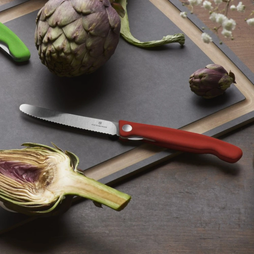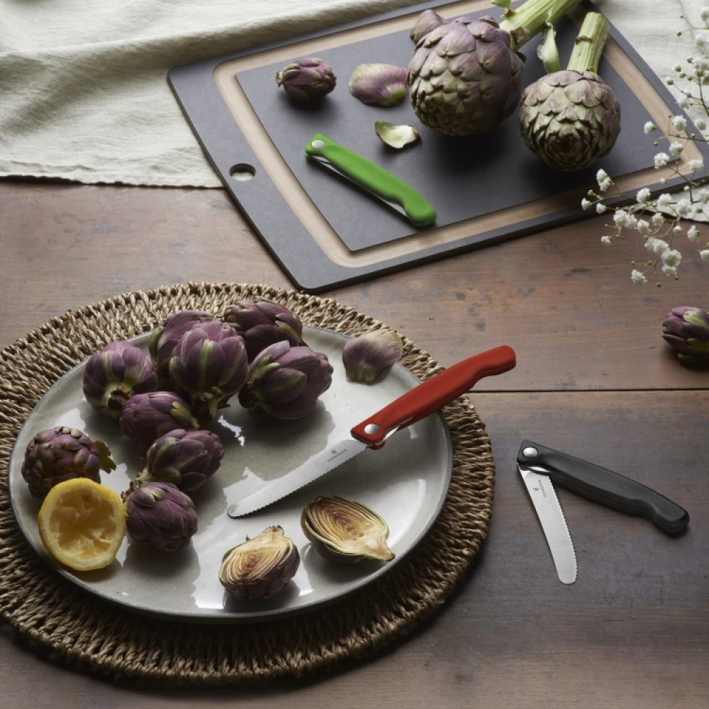 Med en riflet sammenleggbar kniv fra sveitsiske Victorinox kan du enklere skjære brød og tomater eller skrelle sitrusfrukter på pikniken. Den lille kniven er enkel å folde inn og ut, er lett og er enkel å ta med seg på tur eller utflukter.