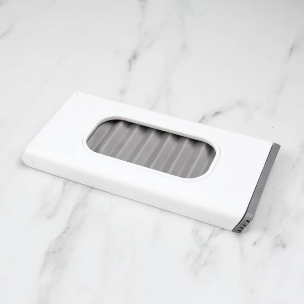 Skiven står stødig på den rillede plassen og lener seg mot folderyggen. Den gummierte undersiden sørger for at servantstativet sitter godt på vasken. Tallerkenstativet er også gummiert på den rillede delen som du setter fatet på og på den sammenleggbare ryggen som du lener fatet mot.
