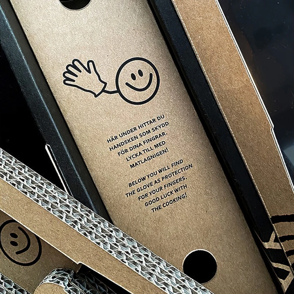 Barnekniven leveres også med en kuttsikker hanske som kan brukes både på høyre og venstre hånd. Hansken beskytter fingrene når du kutter med en kniv, bruker en mandolin eller river på et rivjern. Den kuttsikre hansken kan vaskes i vaskemaskin.