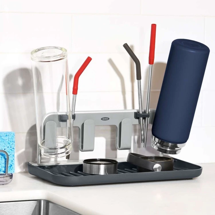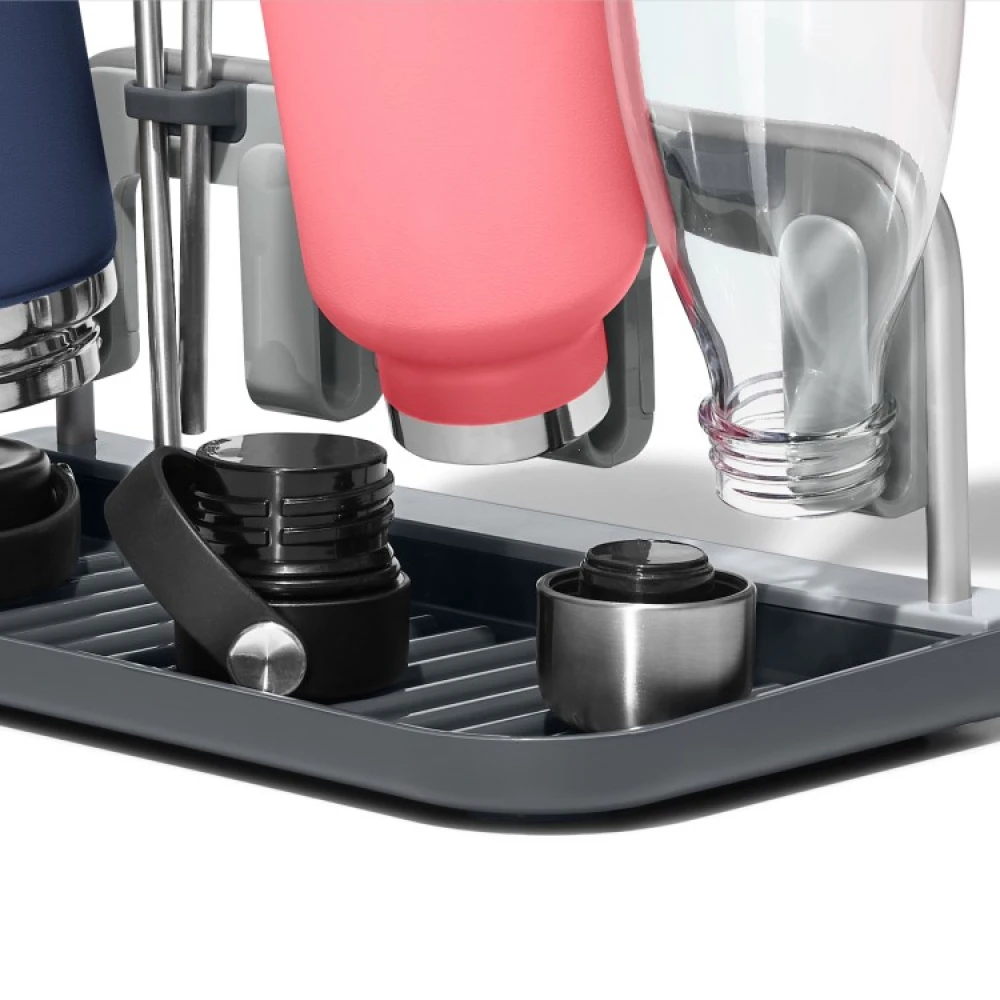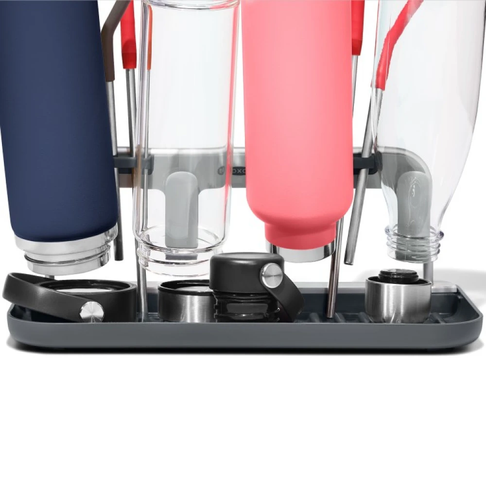 Med et tørkestativ for flasker kan du enkelt la vanskelige vannflasker, termoser og vellingflasker tørke hjemme etter trening og på jobb. Tørkestativet har fire holdere for flasker, ett stort dryppebrett hvor du kan plassere lokkene og to holdere for totalt fire sugerør.