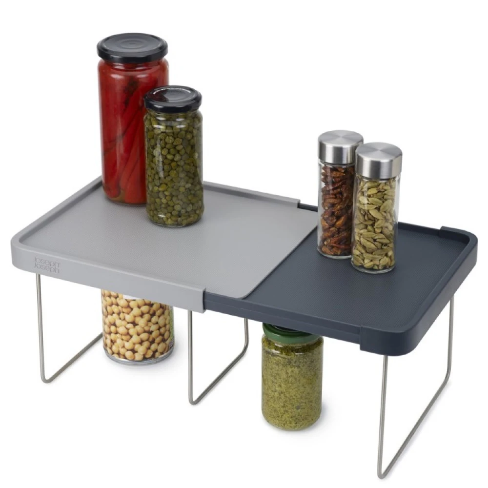 Joseph Josephs uttrekkbare hylle gjør at du effektivt kan utnytte høyden i både skap og skuffer. Hyllen kan tilpasses etter både plass og behov, i tillegg til at den gir deg plass til å stable tingene dine både over og under hyllen.