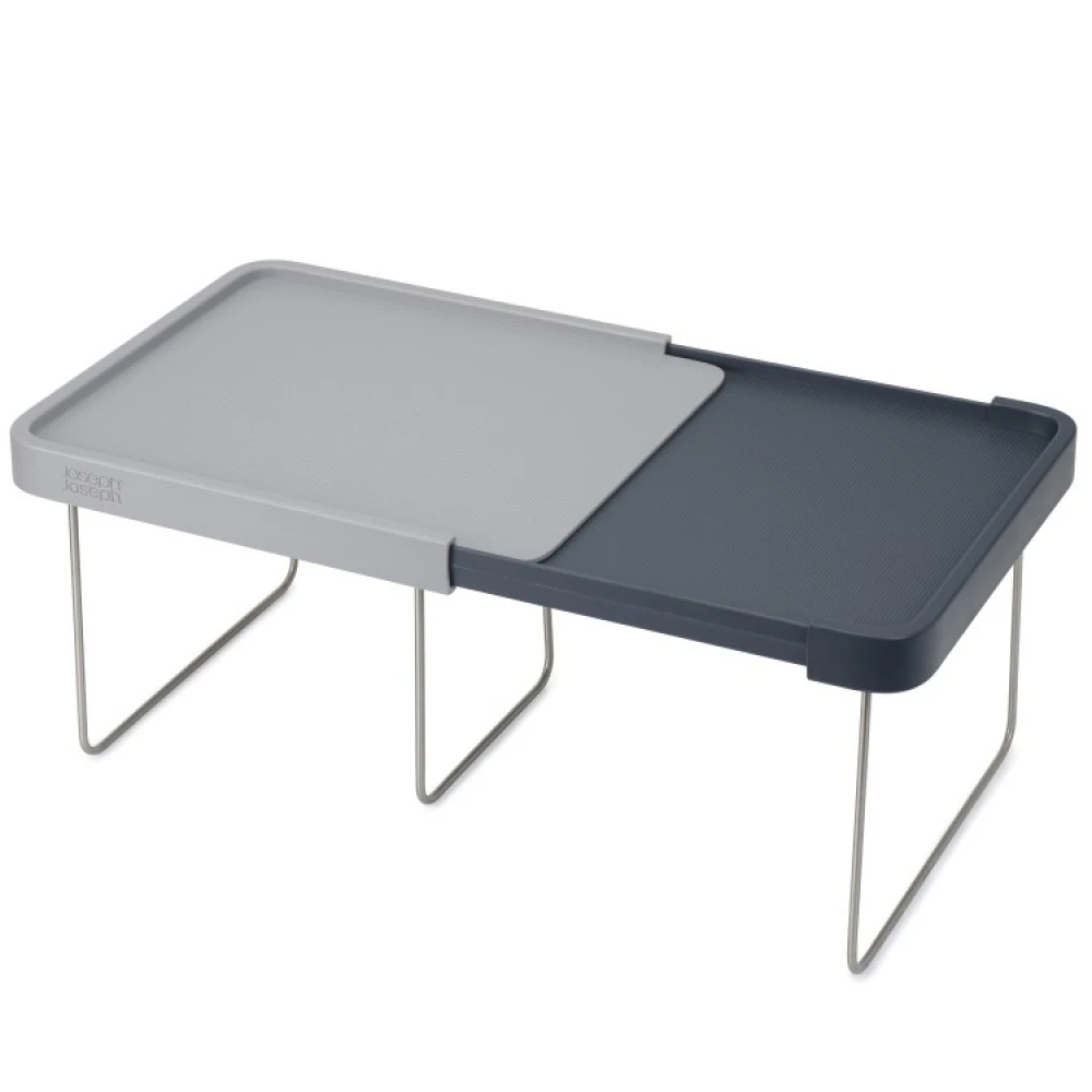 Hyllen har tre uttrekkbare stålben, som gjør at den står stødig. Du bretter enkelt ut bena og drar ut hyllen til ønsket bredde. Den grove overflaten og de hevede kantene forhindrer at tingene faller av hyllen.