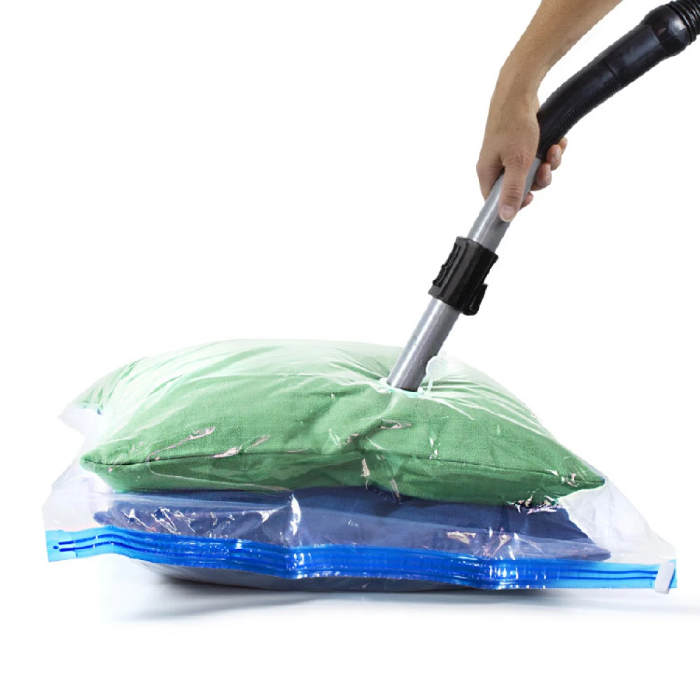 Hvor smarte er vel ikke disse vakuumposene? En vakuumpose gjør det enkelt å oppbevare og spare opptil 80% plass. Fyll posen med klær, dyner, puter m.m. Sug ut overflødig luft med støvsugeren, og du får flate vakuumpakkede pakker. Vakuumposen kan brukes om og om igjen, og universalventilen passer alle støvsugere.